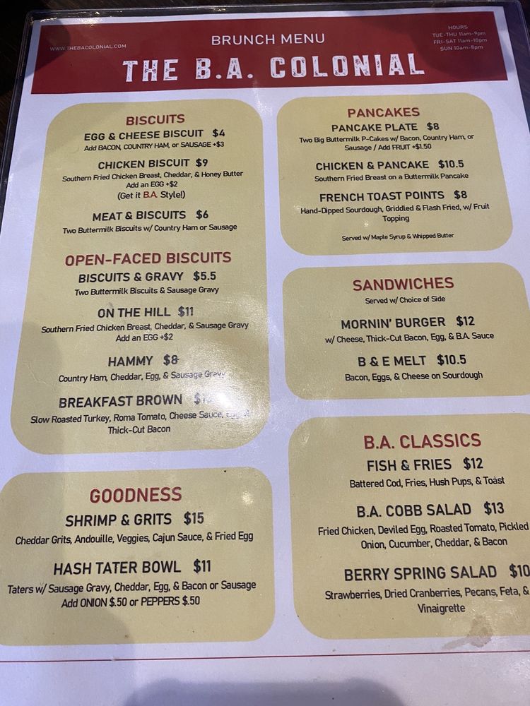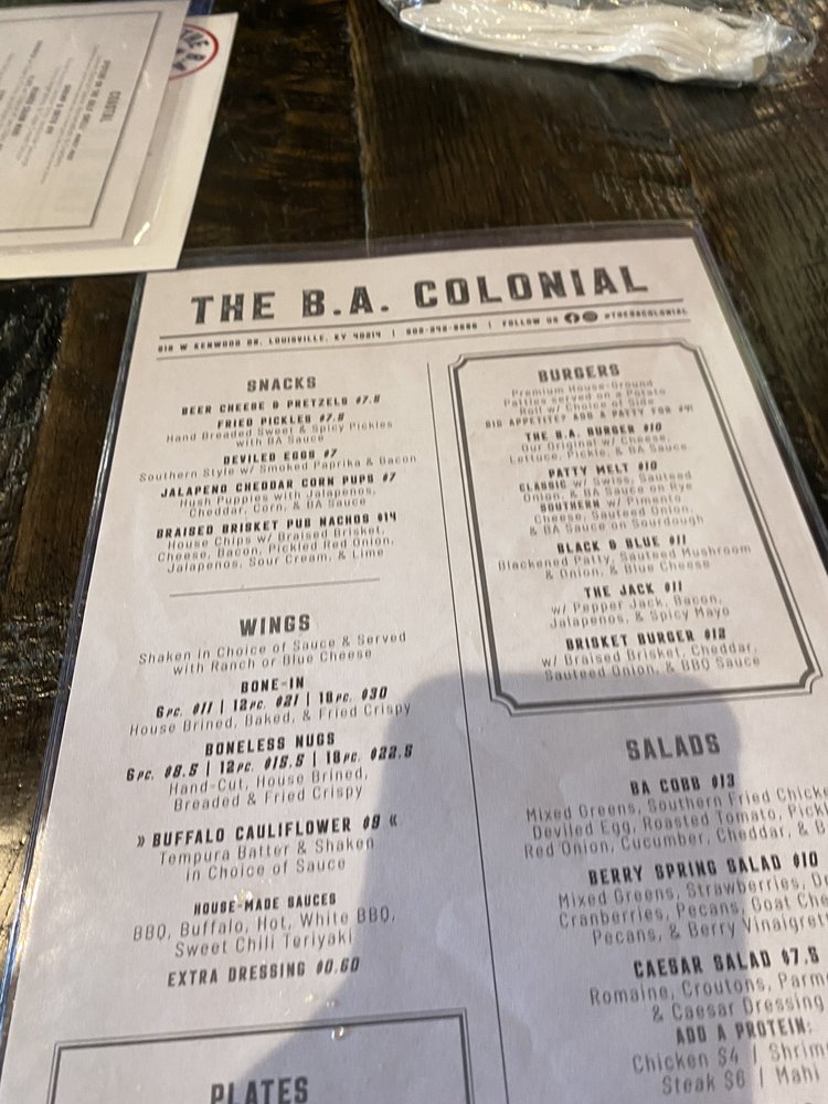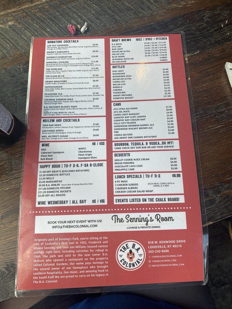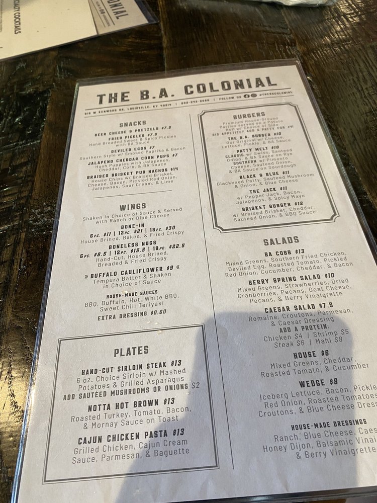 The B.A. Colonial offers a unique dining experience blending New American cuisine with Southern influences. Located at 818 W Kenwood Dr in Louisville, KY, this restaurant provides a cozy atmosphere with outdoor seating options. Customers rave about the mouth-watering menu offerings, such as the southern melt burger with pimento cheese and the delicious broccoli salad. The full bar and attentive waiter service enhance the overall dining experience. Whether you're looking for a casual meal with friends or a family-friendly brunch spot, The B.A. Colonial caters to a variety of preferences. Don't miss out on their delectable skillet cookie with ice cream for a sweet finale. Overall, this restaurant is a must-visit for those seeking a great meal in a welcoming environment.