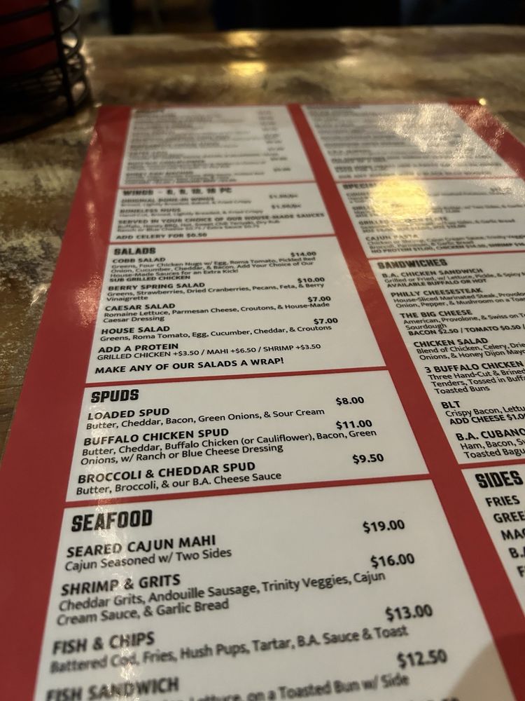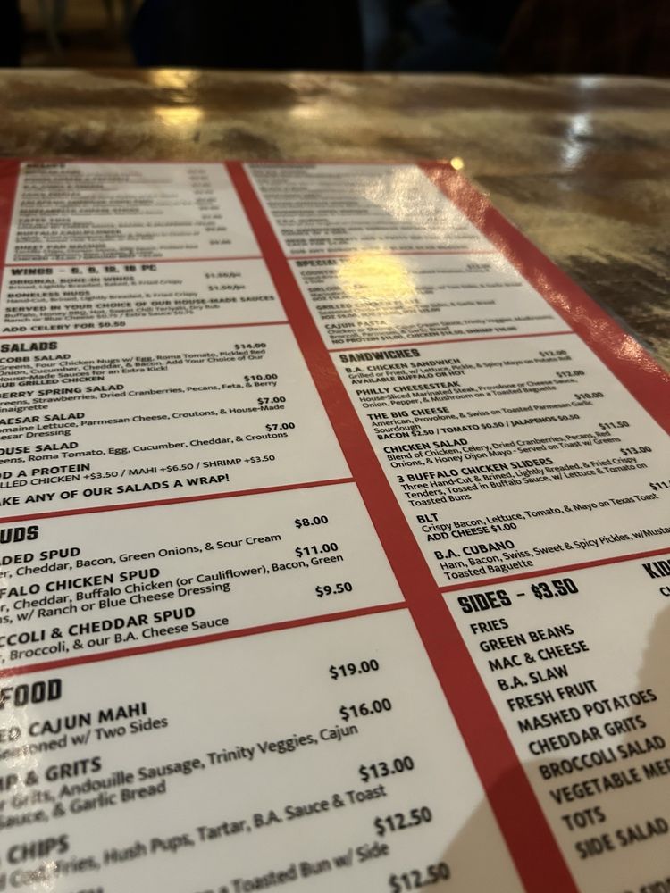 Beer battered cod, fries, and hush puppies with a choice of sourdough or rye bread. Served with tartar sauce and BA sauce.